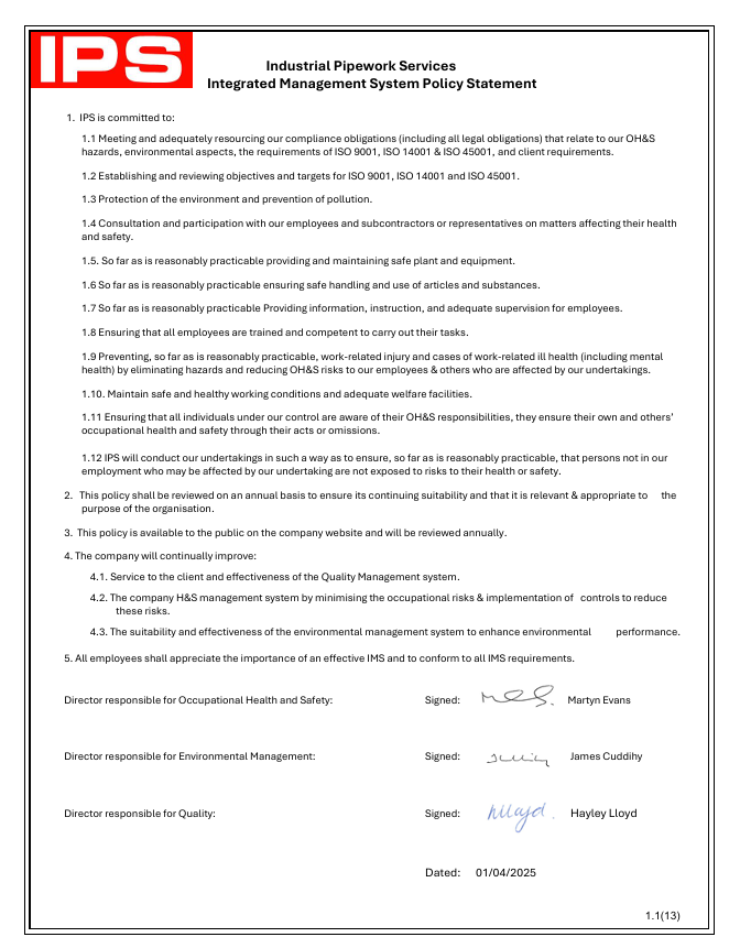 IPS employs its own highly qualified H S & E Manager whilst all aspects of Health and Safety at work are closely managed by our own NEBOSH qualified Safety Advisors, SMSTS & SSSTS accredited Supervisors.