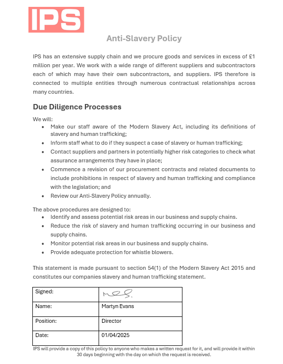 To address this, IPS raises staff awareness of the Modern Slavery Act 2015, reviews suppliers where risks may be higher, updates procurement contracts to include anti-slavery requirements, and reviews its Anti-Slavery Policy annually.